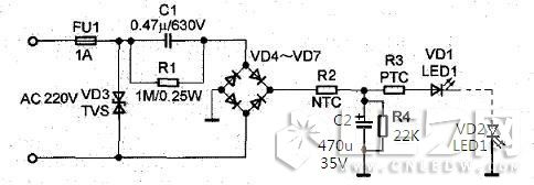 由于電容降壓電源是一種非隔離式電源,在通電瞬間會(huì)產(chǎn)生很大的電流,也就是所謂的浪涌電流。此外,由于外界環(huán)境的影響(如雷擊) 電網(wǎng)系統(tǒng)會(huì)侵入各種浪涌信號(hào),有些浪涌會(huì)導(dǎo)致LED的損壞。所以,要提供熱敏電阻保護(hù),這個(gè)主要有負(fù)溫度系數(shù)熱敏電阻保護(hù)(NTC熱敏電阻,NTC是Negative Temperature Coefficient的縮寫)和正溫度系數(shù)熱敏電阻保護(hù)(PTC(Positive Temperature Coefficient))然后有瞬態(tài)電壓抑制器保護(hù)((Transient Voltage Suppressor),簡(jiǎn)稱TVS)