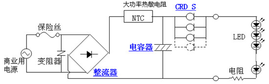 圖中的CRD就是恒流二極管,圖上采用了幾個CRD并聯,以得到所需的恒流值,實際上現在有很多不同恒流值的恒流二極管可供選用,所以也不需要采用并聯的方法來得到所需的恒流值了。所以只要采用一個恒流值相當的恒流二極管和所有LED凈化燈相串聯就可以實現對LED的恒流供電,可見它的電路是十分簡單的!