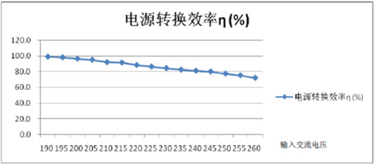 由圖中可以看到,當環境溫度從35度升高到85度時,整個效率隨輸入電壓變化曲線幾乎完全一樣,始終保持在98%以上(包括了整流器的效率在內)。