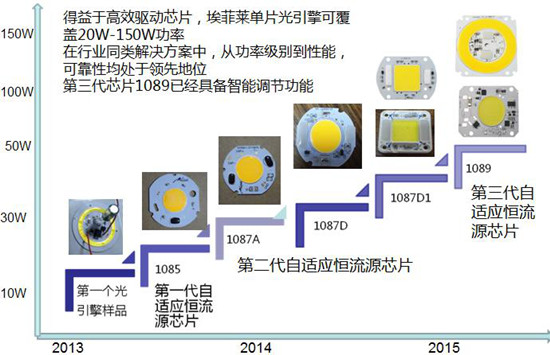 這種智能型LED凈化燈恒流源徹底打破了教科書里描述的線性恒流源效率很低的常規認識,而破天荒地實現了99%的效率。從而可以實現把恒流源和光源放在同一塊鋁基板上,而做成光電一體化的光引擎。因為它本身的功耗極低,所以把它放到光源的鋁基板上不會增加LED的結溫。深圳埃菲萊公司采用這種智能型恒流源已經生產了一系列不同功率的光引擎: