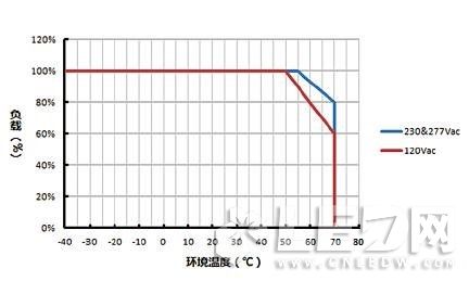 藍色曲線則表示LED驅動器在輸入230Vac或 277Vac情況下,其負載隨環境溫度變化的功率降額曲線,其原理類同。