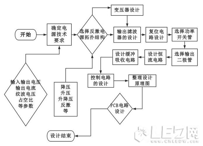 如同開關電源設計一樣,LED凈化燈驅動反激電源也是先進行總體考慮,然后對電源各部分分別進行設計,接下來就是設計總體和輔助功能,最后進行測試和設計優化的。下面設計步驟流程: