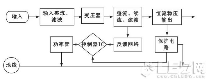 任何電源要實現恒流功能,均需對電源的輸出電流進行檢測取樣,與電流設置值即參考值進行比較,經負反饋放大調節(P、PI、PID)。線性串聯穩壓是調節調整管的壓降,而開關電源是調節變換器的脈寬(或占空比),維持輸出電流的恒定。