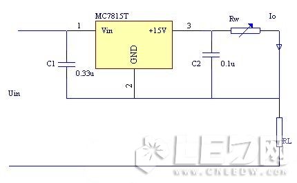 恒流輸出電路是采用集成穩壓器構成的開關恒流源電路構成如下圖所示。MC7815為三端固定式集成穩壓器,RL為LED二極管負載電阻,RW為可調電阻器。