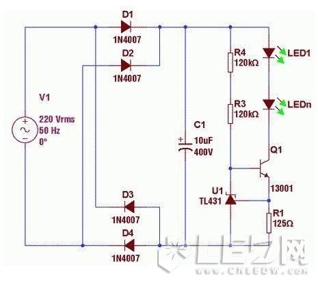 如上圖,即是利用單個(gè)TL431恒流的示意圖。這種電路的原理非常簡單,主要利用了431的2.495V的基準(zhǔn)來做恒流,并且同樣限制了LED上面的壓降,但優(yōu)點(diǎn)與缺點(diǎn)同樣明顯。