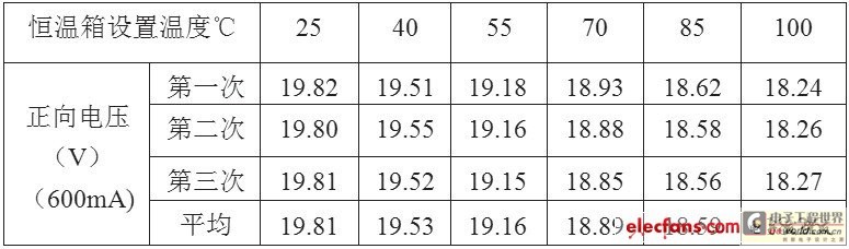 確定正向電壓與結溫的關系的試驗步驟為:1)將光源置入恒溫箱中;2)設置恒溫箱的溫度;3)待恒溫箱內溫度充分平衡穩定后,在光源兩端接入恒流源;4)迅速測量光源的正向電壓并記錄;5)重復上述步驟1)~(4),恒溫箱溫度由低到高,測得多點數據。